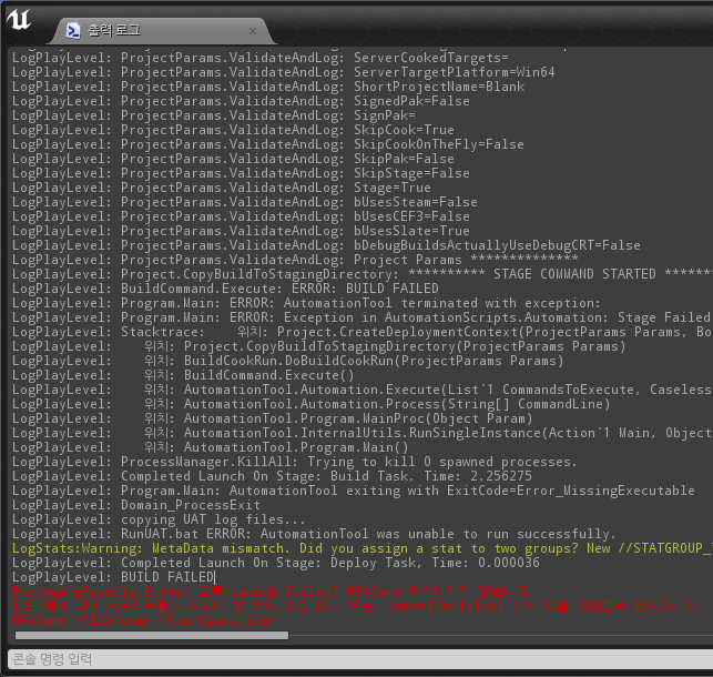 만약 해당 구성으로 빌드한 적이 없다면 또 "UE4Game 바이너리가 없습니다" 라는 에러 메시지를 만나게 되겠죠.