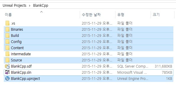 프로젝트 관련 ( 임시 ) 파일들은 "Engine/Intermediate" 디렉토리 안에 생성된다.