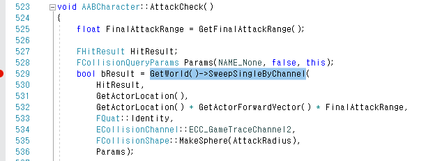 이제 GetWorld()->SweepSingleByChannel() 함수를 타고 들어 갈수 있게 된다.