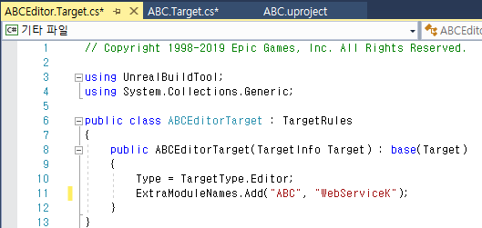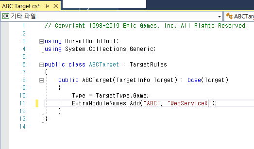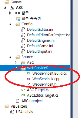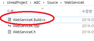 이는 처음부터 직접 만들기 복잡하니 ArenaBattle에 있는 ArenaBattle.Build.cs 파일을 복사해와 이름을 WebService.Build.cs로 변경한 후에 내용만 변경하도록 합시다.
