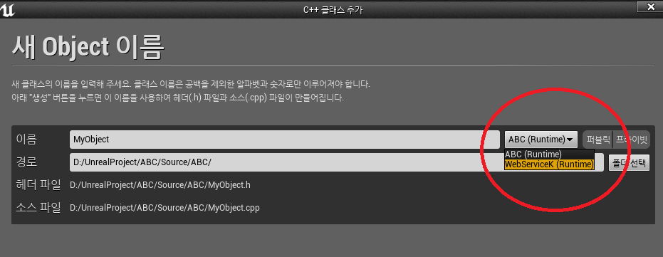 WebConnection이라고 새롭게 생성할 언리얼 오브젝트의 이름을 입력하고, 오른쪽의 모듈 목록을 보면 우리가 만든 WebService라는 모듈이 뜬 것을 볼 수 있습니다. 이를 선택하여, WebConnection 언리얼 오브젝트가 WebService 모듈로 추가되도록 설정합시다.