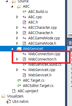 다시 비주얼 스튜디오를 살펴보면 WebConnection 헤더파일과 소스파일이 추가된 것을 볼 수 있습니다.