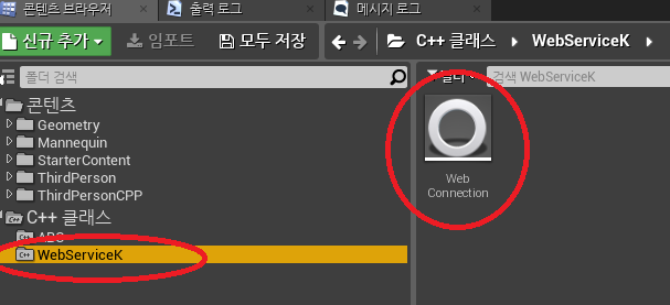 이제 에디터를 다시 실행해보면 드디어 아래와 같이 모듈에 WebService가 새로 생기고 WebConnection이라는 언리얼 오브젝트가 추가된 것을 확인할 수 있습니다.