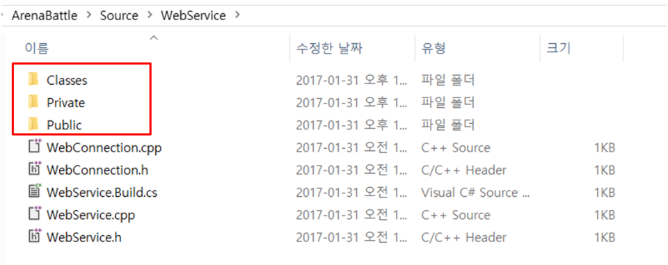 우리 모듈에도 이 규칙을 적용시킵시다. WebService 폴더에 Public, Private, Classes 폴더를 생성합시다.