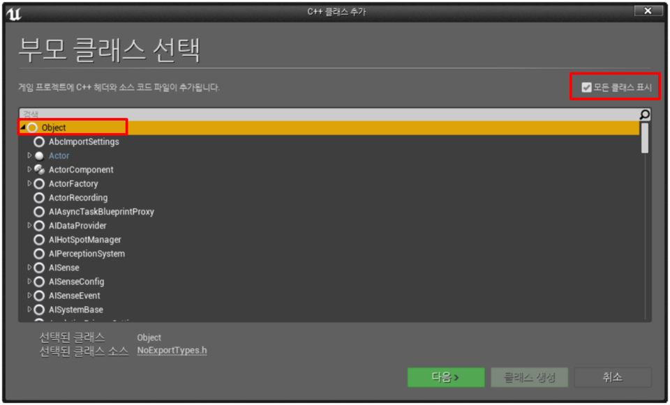 에디터를 닫지 말고 파일 메뉴에서 "새로운 C++ 클래스 추가" 메뉴를 눌러서 모든 클래스 표시를 누른 후 최상단에 있는 Object를 선택합시다. Object는 다음 챕터에서 설명할 언리얼 오브젝트의 최상위 기본 클래스입니다.