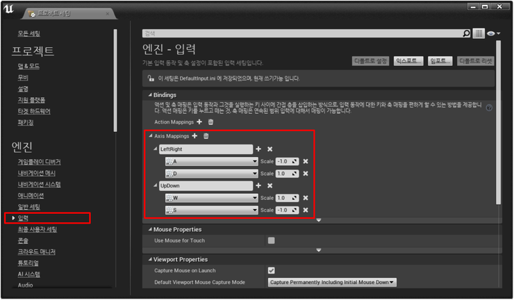 먼저 프로젝트 설정의 입력으로 가서 Axis Mapping에 UpDown과 LeftRight 입력을 아래 그림과 같이 설정합시다.