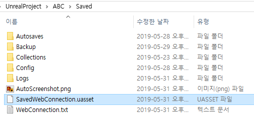 컴파일을 하고 플레이를 누르면 아래와 같이 Saved 폴더에 uasset 파일이 생성된 것을 확인할 수 있습니다.