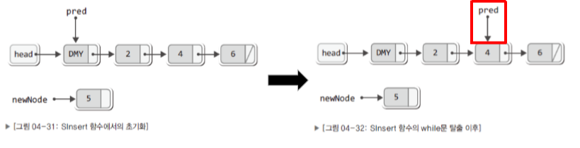 pred = pred->next; // 다음 노드로 이동, (뒤 노드로 이동)