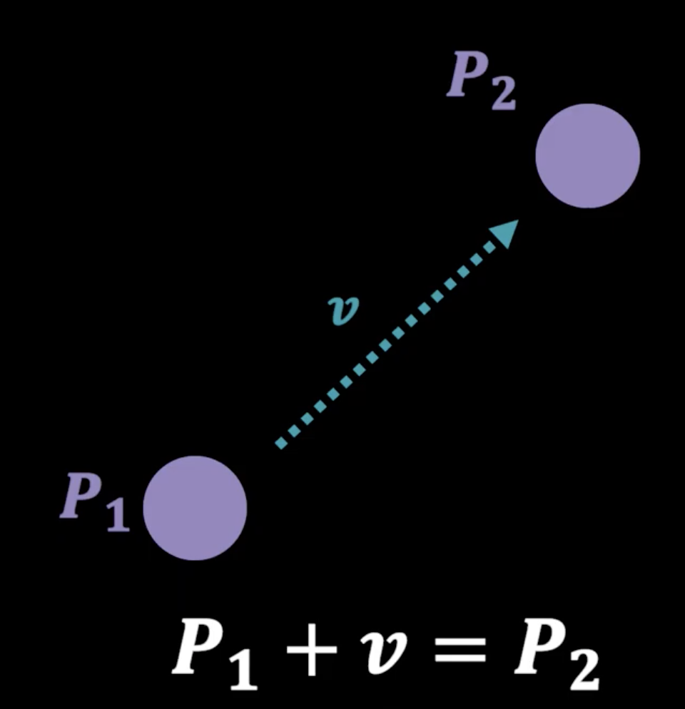 p1 (아핀공간 물체) 에 v (이동벡터의 힘과 방향)으로 p2 가 됨