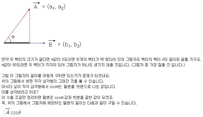 - a,b가 단위 벡터라면, 내적의 결과는 코사인세타(cos) 이므로 범위는 -1 ~ + 1 이다 결과는 스칼라값