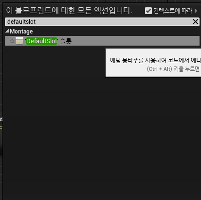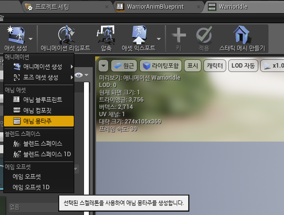 * 애니메이션창을 열고 애님 몽타주 생성 메뉴를 눌러 몽타주 애셋을 생성한다.