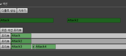 * 이번에는 각 공격 동작을 섹션으로 분리한 후 일정 시간 내에 공격명령을 내리면 다음 공격 동작으로 이동하는 콤보 공격을 구현해 본다. Attactk2, Attactk3, Attactk4의 이름으로 새로운 섹션을 추가하고 섹션마다 공격 애니메이션을 하나씩 할당한다.