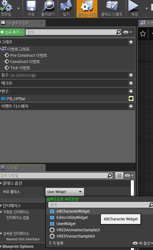 완성후 그래프 탭에서 클래스 세팅 버튼을 누른 후 부모클래스가 ABCharacterWidget으로 변경한다.
