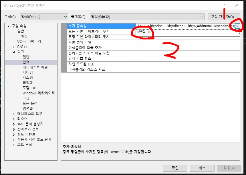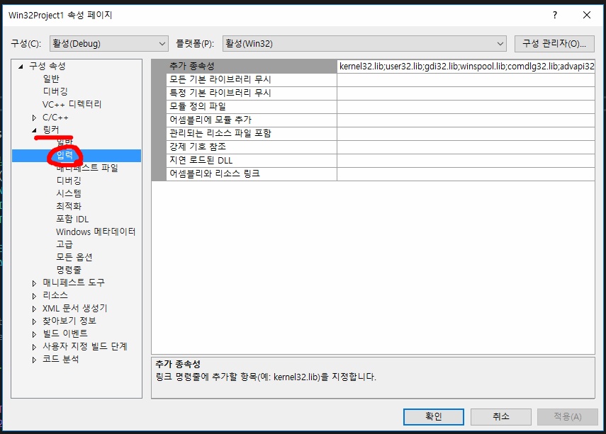 추가 종속성 부분에 우리가 사용할 d3d9.lib , d3dx9.lib , winmm.lib 이 3개를 써주자