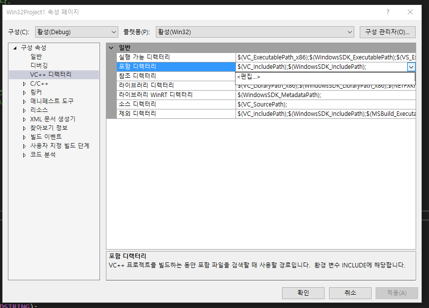 구성 속성 -> VC++ 디렉터리를 클릭한다.